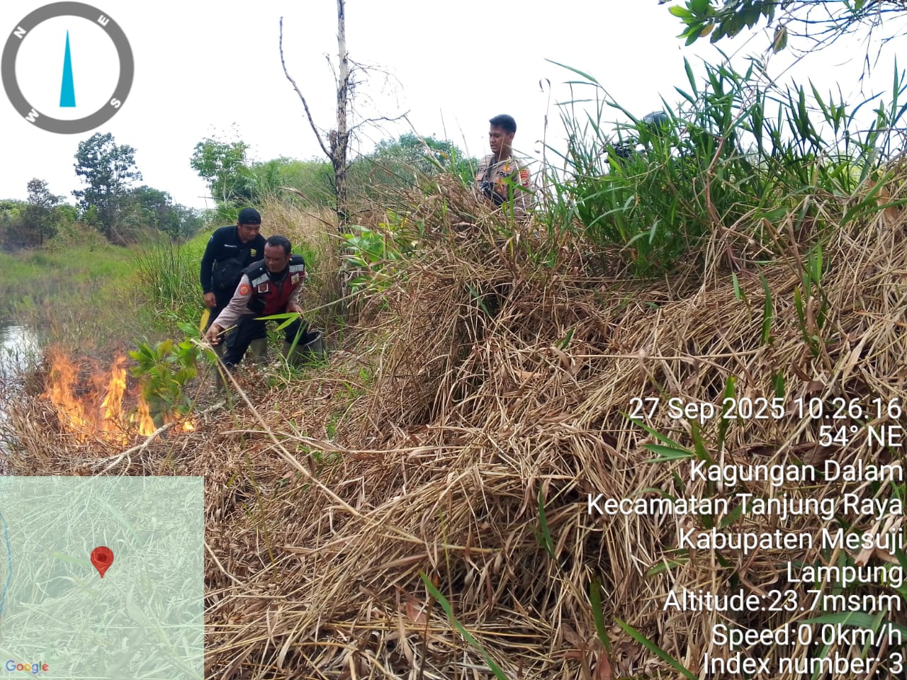 Mesuji – Personil Sat Samapta Polres Mesuji dan Anggota Polsek Tanjung Raya bersama Karyawan serta Warga Desa Tanjung Sari dan Kagungan Dalam dari malam hari hingga siang hari berjibaku memadamkan api kebakaran lahan HGU milik PT. BSMI yang terjadi di Blok S dan T 39, 30, 31, 32, 33, 34, 35, 36.